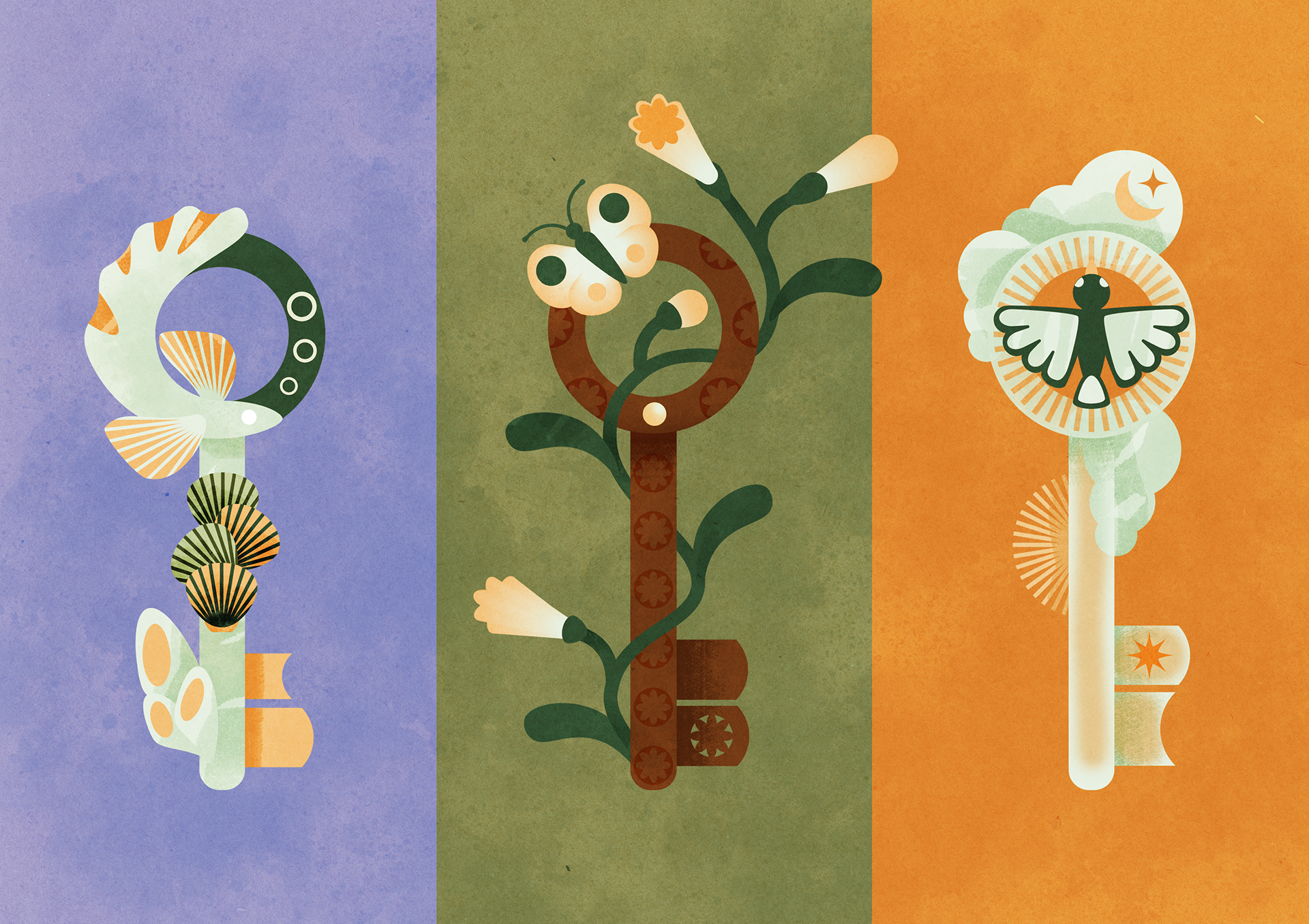 Arte conceptual de tres llaves que representan el agua, la tierra y el cielo. Realizadas en Adobe Illustrator y Photoshop.